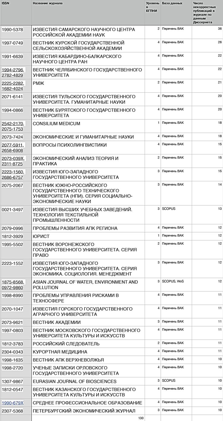 Для того чтобы разобраться в вопросе качества журналов, попавших в Перечень ЕГПНИ, мы воспользовались данными Диссернета. В базе данных сообщества в настоящий момент содержится 1463 наименования журналов, в которых были обнаружены нарушения публикационной этики. Из них мы отобрали только журналы с самыми грубыми нарушениями, и кроме того, с десятью и более некорректными публикациями в каждом из журналов. К некорректным публикациям Диссернет, в соответствии со сложившейся мировой практикой, относит публикации с плагиатом, фиктивным авторством и дублирующие статьи. В итоге получилось 130 журналов-нарушителей, 31 из которых, как оказалось, вошли в новый Перечень ЕГПНИ. Список таких журналов приведен в таблице и ранжирован по убыванию числа некорректных публикаций. Рассмотрим эти журналы подробнее.