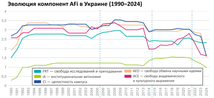 Украина испытала резкий спад академической свободы дважды: после аннексии Крыма в 2014 году и с началом полномасштабного российского вторжения в 2022 году. Причем в обоих случаях больше всего страдала свобода выражения (ACE). Это связано с тем, что в условиях внешней агрессии общество консолидируется вокруг идеи национальной идентичности и разрыва любых, в том числе интеллектуальных, связей со страной-агрессором (эффект сплочения вокруг флага). То, что показатели неприкосновенности кампусов (CI) и свободы академических обменов (AED) снижались меньше и позднее, чем свобода выражения (ACE), а свобода исследований и преподавания (FRT) вовсе почти не пострадала, позволяет предположить, что в Украине власть скорее сама следовала за общественными настроениями, чем навязывала обществу ограничение свобод. Тем не менее, самоцензура — при всей понятности ее причин — точно так же, как и прямая цензура, ведет к снижению свободы слова и мысли. Это одно из прямых последствий войны.