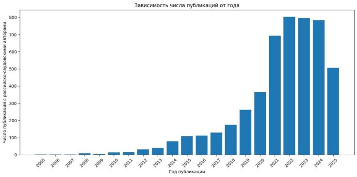 Для анализа частной ситуации с российско-саудовскими работами была использована статистика публикаций, собранная на портале OpenAlex (это библиографический каталог научных статей, авторов и организаций, доступный в режиме открытого доступа). Были отобраны публикации типа article (научные статьи), среди авторов которых присутствовал хотя бы один из России и Саудовской Аравии. Для практических целей количество соавторов в статье было ограничено числом двенадцать, что помогает отсечь крупномасштабные международные научные проекты. Зависимость числа таких статей от года публикации показана на рисунке ниже.