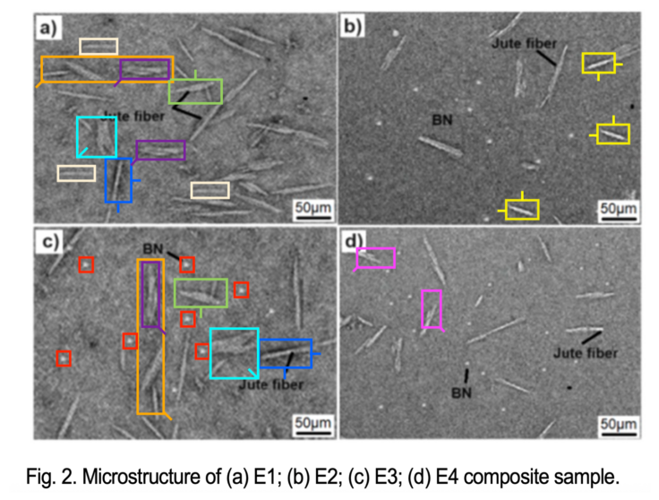 Приведем еще один показательный пример манипуляций изображений в работах Исмаила Хоссейна — фотографии микроструктуры исследуемых образцов, опубликованные также в 2025 году в журнале Journal of Mechanical Science and Technology (Springer Nature) в статье Injection mould processing and characteristics measures of hybrid epoxy composites with jute fiber/boron nitride (см. рисунок ниже). Рецензент портала pubpeer.com отмечает большое количество дубликатов внутри панелей и между ними, с поворотом или без. Некоторые из них выделены с помощью цветных рамочек. Эта статья также до сих пор не отозвана из журнала.