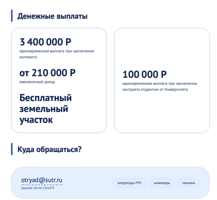 Второй важный тренд — еще одни выплаты новым контрактникам, уже от самого вуза. Сочинский госуниверситет докидывает поверх единовременной выплаты (3 400 000 рублей) и ежемесячной «зарплаты» (210 000 рублей) еще 100 000 рублей из бюджета вуза.