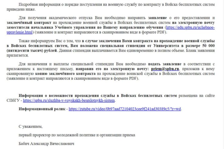 Администрация Санкт-Петербургского государственного университета 17 февраля разослала студентам письма с предложением заключить контракт на службу в войсках беспилотных систем и пообещала «специальную стипендию» — единовременную выплату в размере 50 000 рублей.