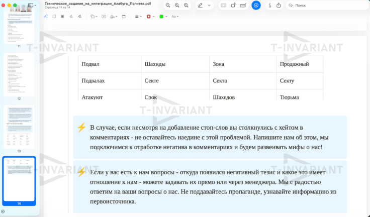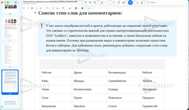 Первое техзадание, имеющееся в распоряжении T-invariant, активно рассылалось ютуб-блогерам за 10 дней до начала вторжения РФ в Украину. Тогда с ютуберами связывалась лично руководитель маркетинга и PR управления по привлечению инвестиций ОЭЗ «Алабуга» Дания Уталиева (прекратила работать в ОЭЗ весной 2024 года).