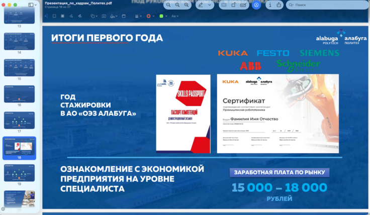 Тем не менее, в начатой в конце февраля 2026 года новой большой рекламной кампании «Алабуга Политех» вся история успеха построена именно на том, что подростки работают «на самом крупном в мире заводе по производству беспилотников». Обещают, что уже на первом курсе студенты смогут зарабатывать большие деньги (в промо-видео фигурируют суммы от 150 до 350 тысяч рублей в месяц), а «родители будут ими гордиться».