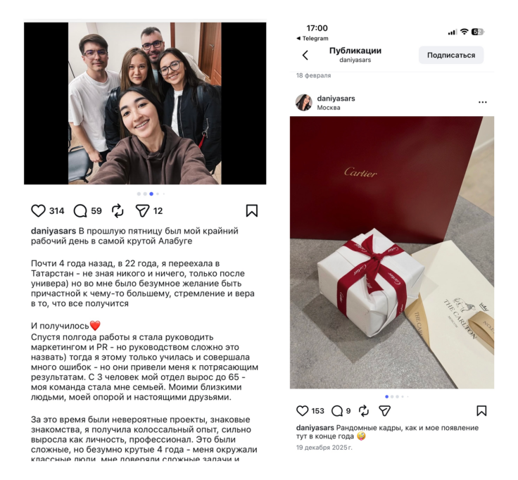 Экс-PR-директор ОЭЗ «Алабуга» Дания Уталиева (на момент увольнения из фабрики дронов ей было 25 лет) также размещает в своем Instagram (сделала свой аккаунт закрытым в процессе подготовки этого материала) фото из путешествий по всему миру и подаренные ей украшения марки Cartier.